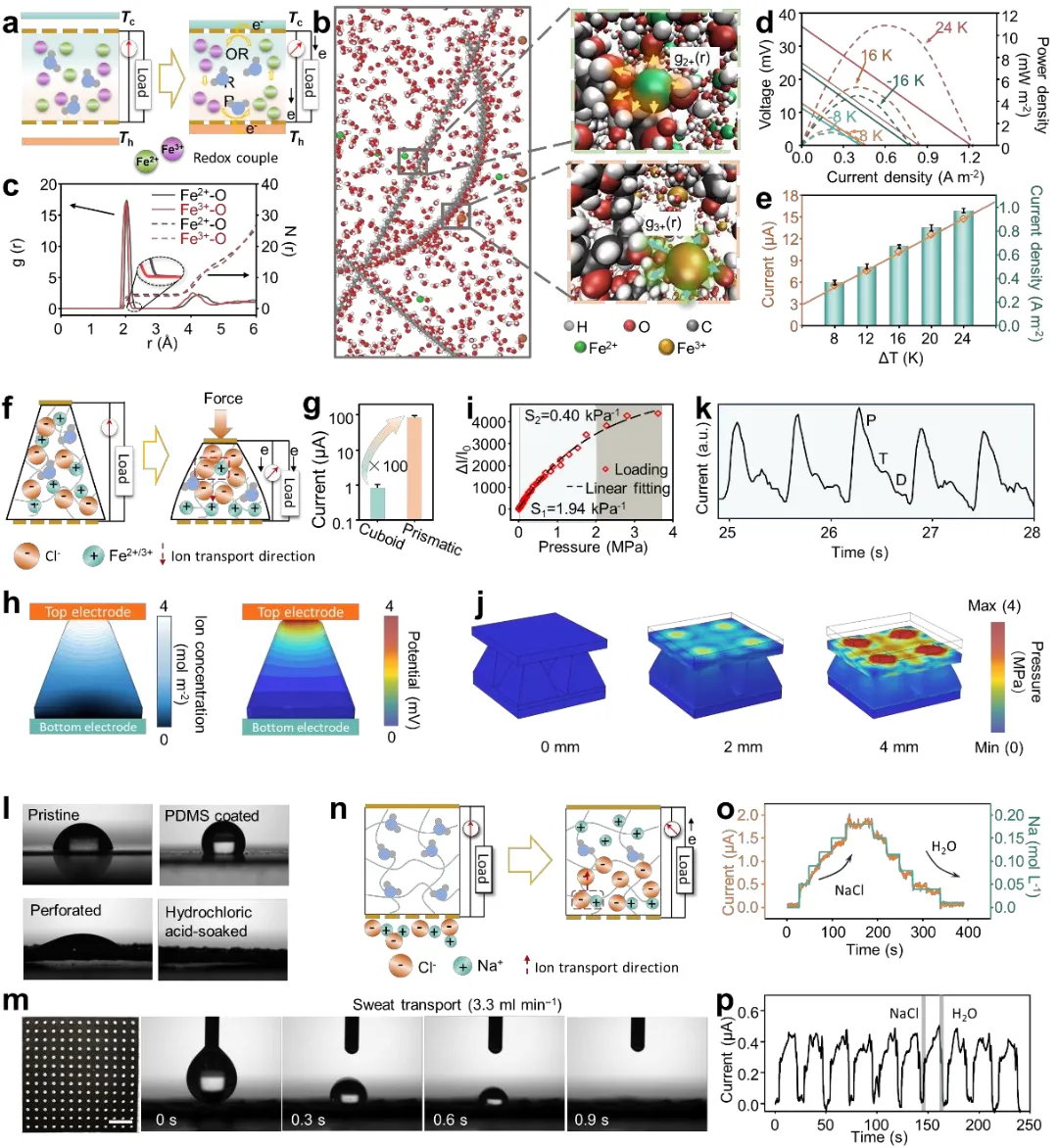 a. 水凝胶电子皮肤模仿人类皮肤的三种感知机制:自由神经末梢(温度)→热电流效应;梅克尔细胞(压力)→压电离子效应;鲁菲尼小体(电解质)→扩散效应。