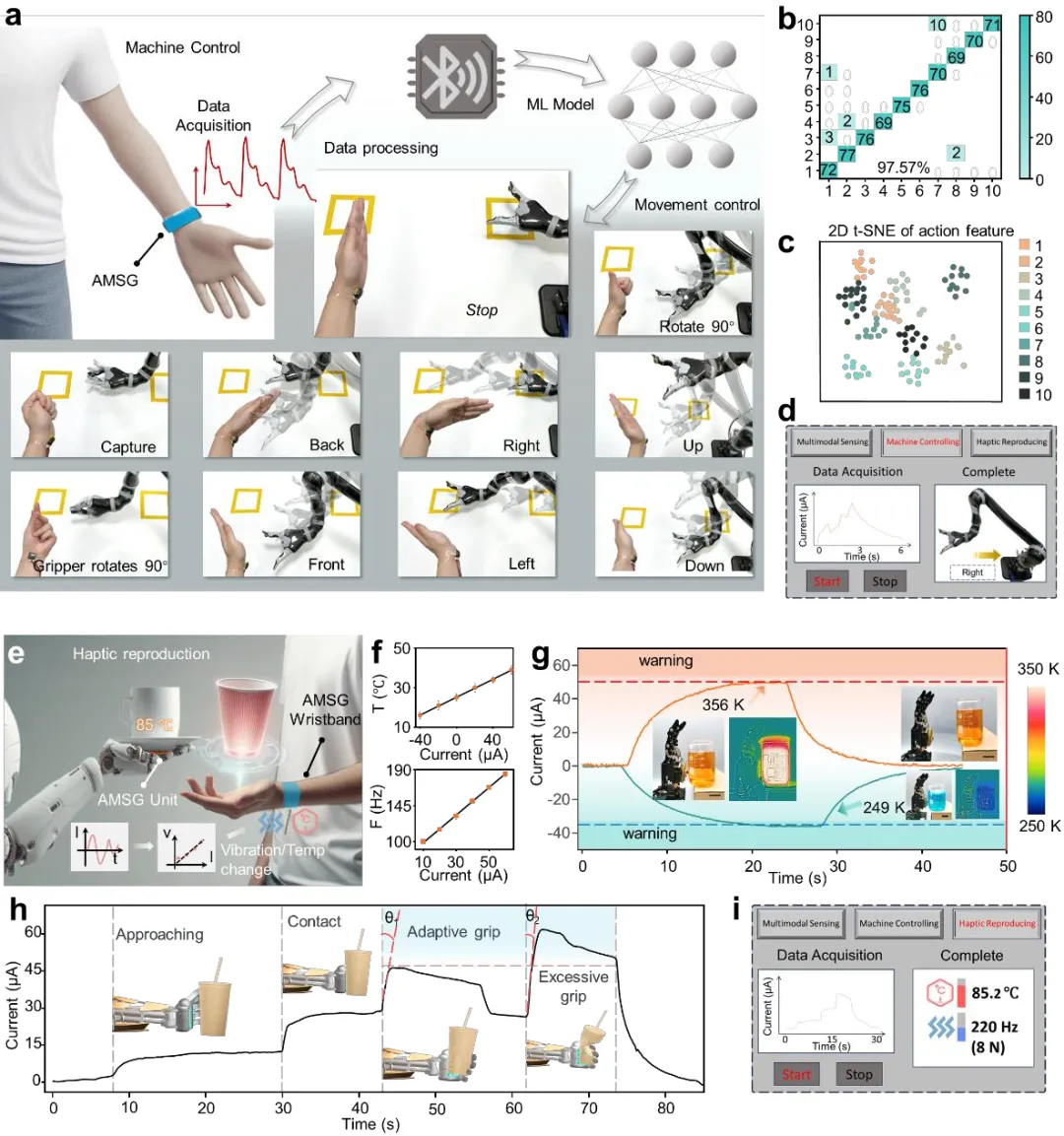 a. AMSG腕带模拟多刺激(温度、压力、Na⁺)感知示意图。