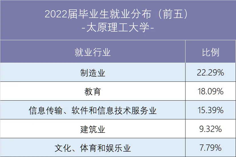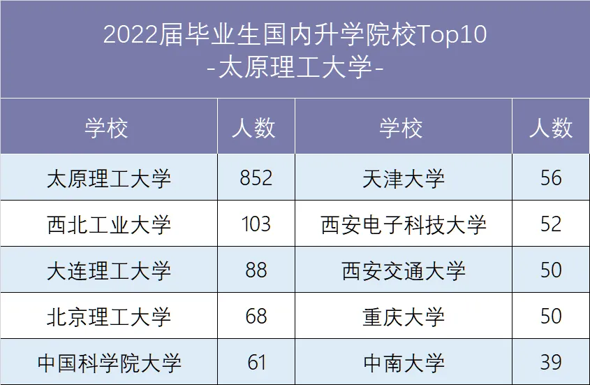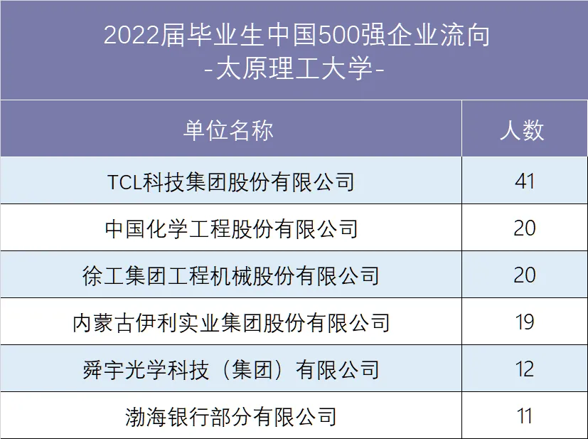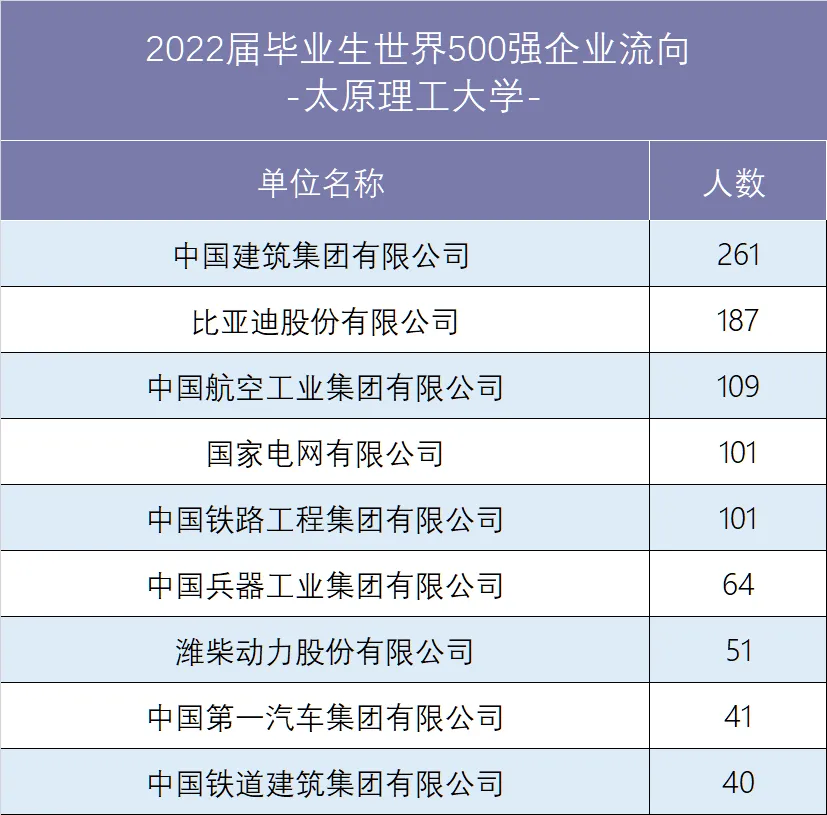 太原理工大学2022届毕业生共9971人, 其中本科毕业生7763人,硕士研究生2155人,博士研究生53人。截至2022年12月27日, 2022届毕业生整体就业率为90.07%, 其中本科毕业生就业率为88.11%, 硕士毕业生就业率为97.03%, 博士毕业生就业率为94.34%。有2463人选择在国内继续深造,包括本科毕业生2443人,占本科毕业生人数的31.47%,硕士毕业生200人,占硕士研究生人数的9.28%。134人选择出国、出境深造,其中本科毕业生125人,占本科毕业生人数的1.61%,硕士毕业生9人。占硕士研究生人数的0.42%。出国、出境毕业生中97人升入QS前100高校,占比72.39%。2022届“签劳动合同形式就业”和“签就业协议形式就业”的毕业生中,有31.49%的毕业生就职于世界级中国500强企业。世界500强企业流向详见下表:1997年,太原工业大学与直属于国家煤炭工业部的山西矿业学院(始建于1958年)合并,组建太原理工大学,同年跻身国家“211工程”重点建设大学行列。2017年,学校入选国家“双一流”建设高校。