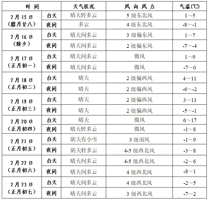 2月13日,山西省气象台发布春节期间全省及太原市天气预报。