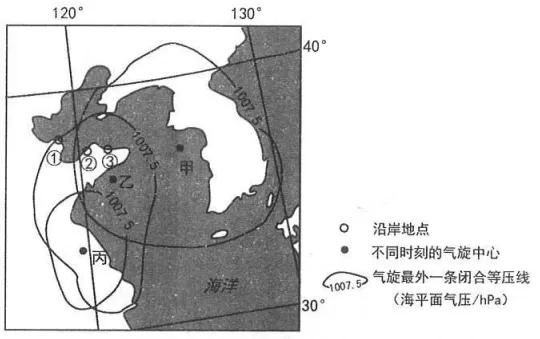 下图示意某年3月某气旋从生成到成熟的发展历程。甲、乙、丙为气旋发展过程中的三个不同时刻。此次气旋移动引发的风暴潮使部分区域受灾明显。据此完成7~9题。