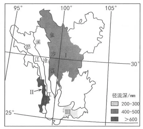 地形对降水的作用:Ⅱ区位于怒江谷地西侧山地,夏季风受地形强烈抬升,降水丰沛(径流深>600mm); Ⅰ区地处金沙江河谷东侧,地形抬升强度弱于Ⅱ区,降水减少(径流深400—500mm);Ⅲ区地形格局分散,海拔较低,集水区域内地形抬升效应最弱,降水条件逊于Ⅰ区(径流深200—300mm)。(2分)
