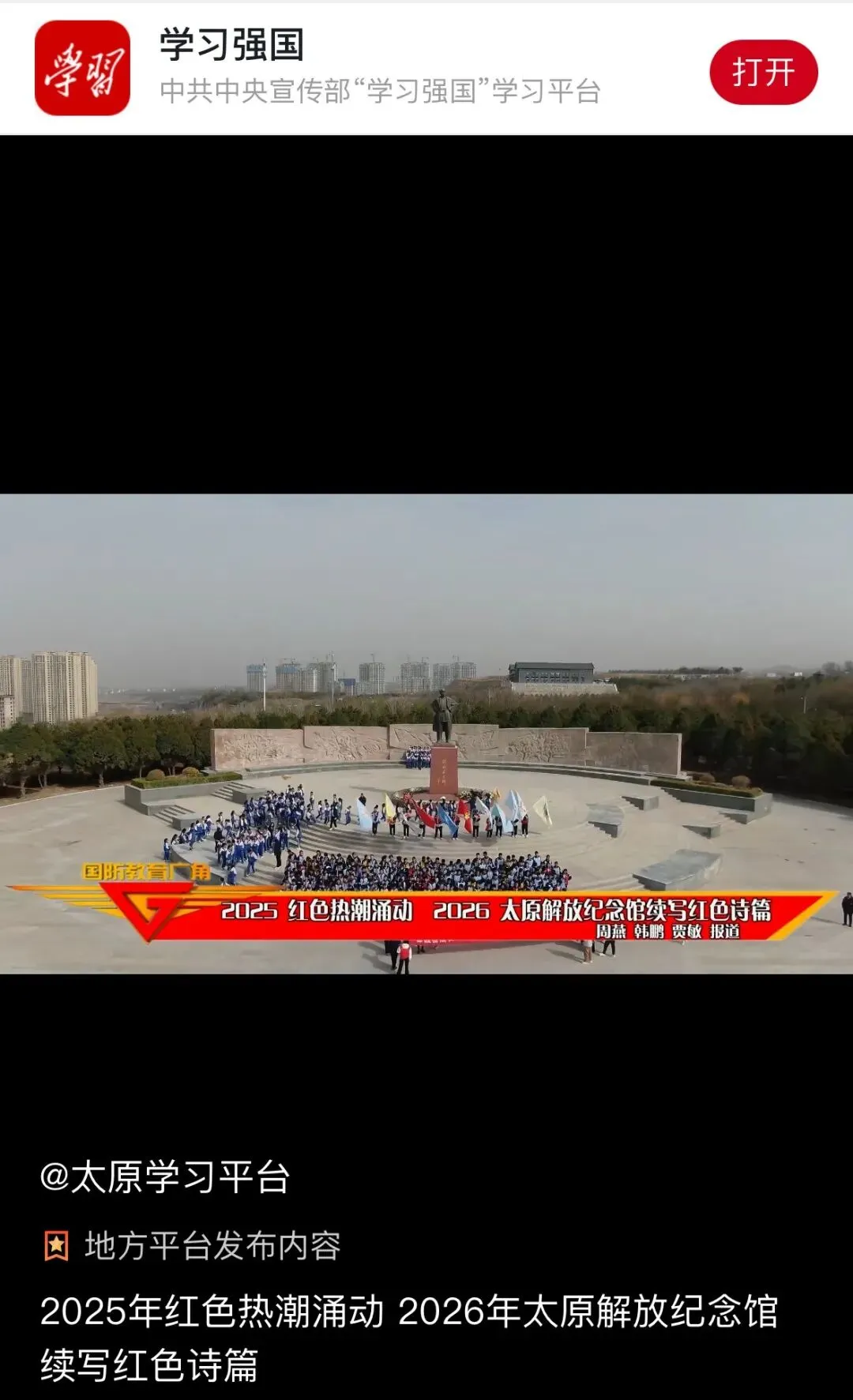 红色热潮涌动,初心使命赓续。学习强国太原学习平台专题报道“2025 红色热潮涌动 2026 太原解放纪念馆续写红色诗篇”。