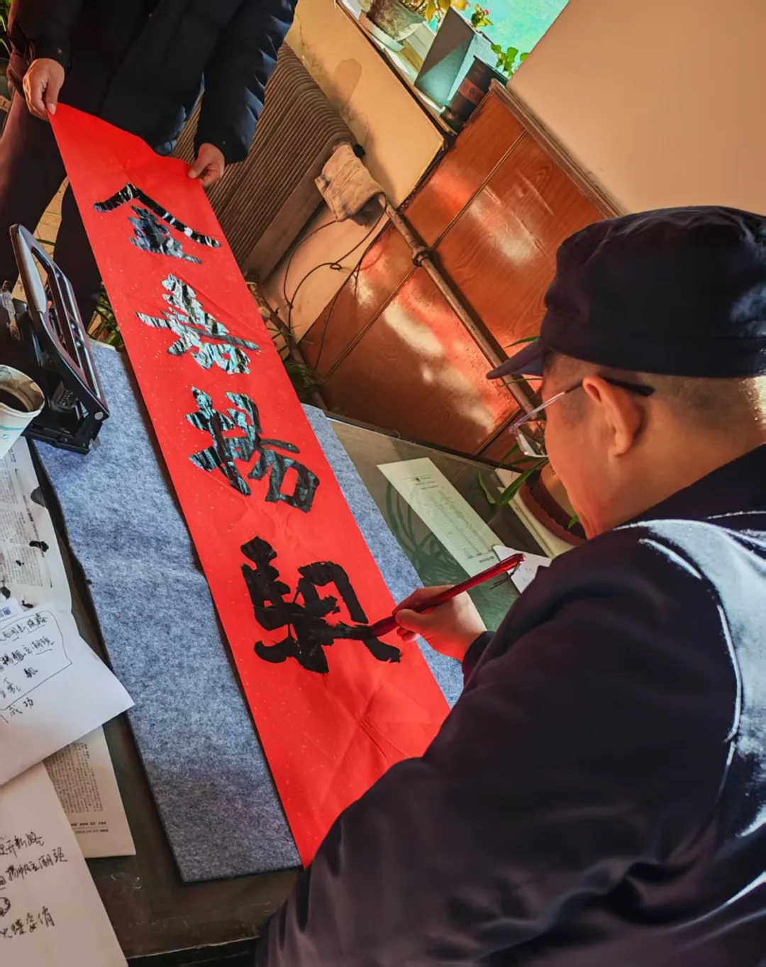 活动当天,物业服务中心大厅内墨香四溢,特邀的书法老师与物业工作人员早早布置好场地,红纸、墨汁、毛毡等工具一应俱全。书法老师们挥毫泼墨,笔走龙蛇,一副副寓意吉祥、字体隽秀的春联在笔下诞生。一句句吉祥话、一幅幅红春联,承载着对新年的美好期许,也传递着物业对业主的诚挚祝福。