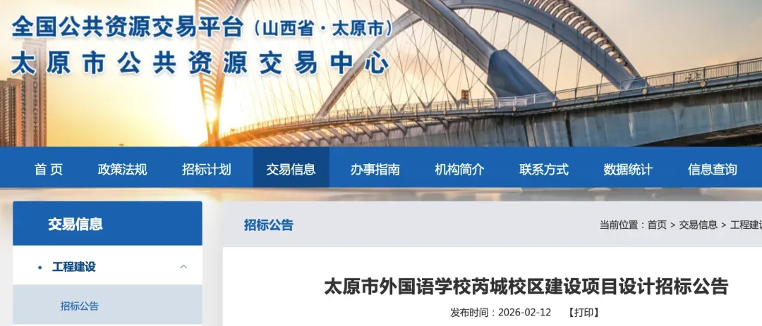 2月12日,全国公共资源交易平台发布《太原市外国语学校芮城校区建设项目设计招标公告》、《太原市外国语学校芮城校区建设项目勘察招标公告》。