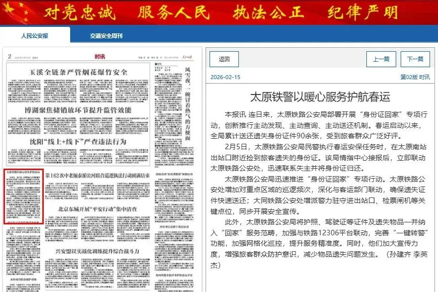 太原公安处总结经验、优化流程,加密车站广场、候车室等重点区域巡逻频次,深化与车站服务台、客运部门联动,让遗失证件快速“归位”;