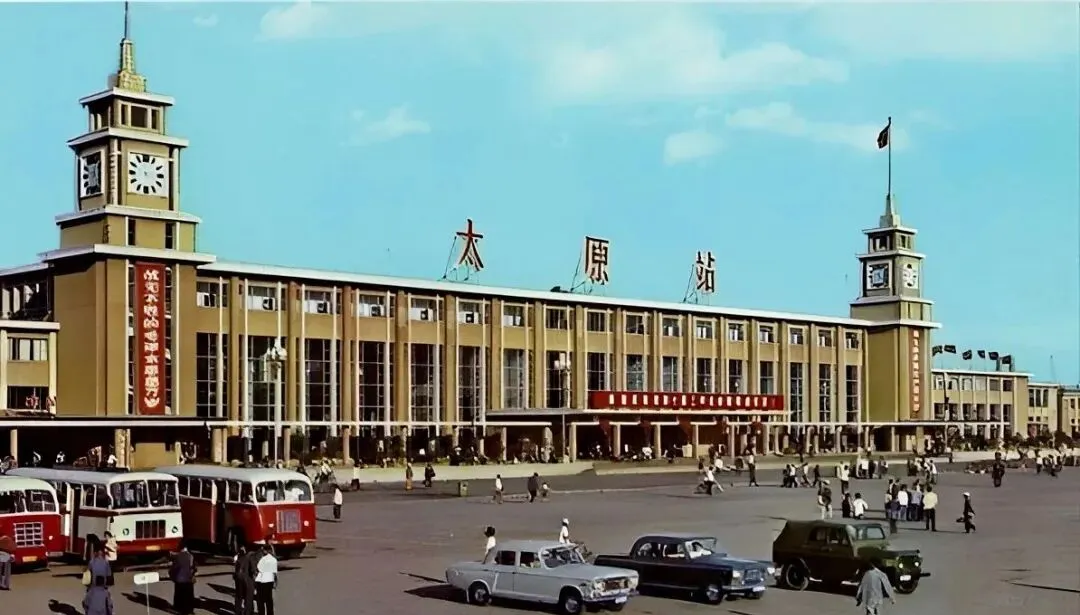 这个带双钟楼的建筑叫太原站,黄灰立面配大玻璃窗,屋檐上“太原站”三个大字红得亮眼,广场上一溜儿“解放牌”和公交停着,人潮提着帆布包和蛇皮袋,一声汽笛拉开一城日常,那会儿出门多靠火车,票攥在手里心也跟着热乎。