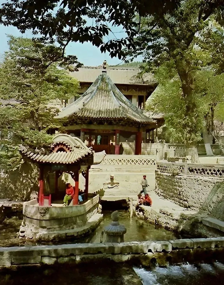 照片里这座阔檐重屋叫圣母殿,灰筒瓦压着,梁枋彩绘沉稳,进殿要跨三道台阶,妈妈小声嘱咐别乱跑,古树把光影切成碎片,落在青石地上有点凉,殿前桥身短而厚,过了桥像把喧闹留在背后。
