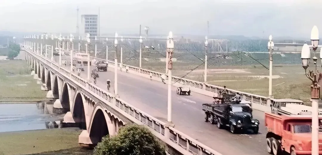 图上的长桥叫胜利桥,一排拱洞压着水面,栏杆边立高杆路灯,桥面上“拉大辫子”的无轨电车慢慢爬,司机手稳,辫子在电线上滋啦一响,咱就知道到站了,那声音比闹钟准。