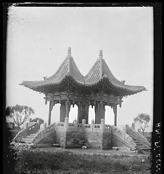 这个讲究的家伙叫双顶亭,两朵攒尖把势儿对着天,台基四面出踏步,石栏板上还有卷草纹,奶奶看见这张就说,以前赶集累了就往这儿一坐,鞋底一脱晾一晾,风从梁下穿过去,脑门子立刻凉半截。