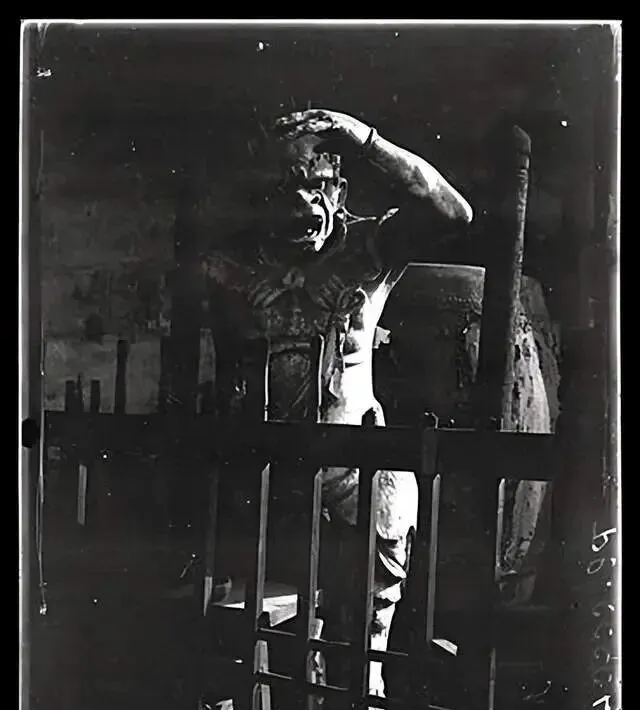 这个立在栅栏后的叫护法像,身子前探,手按额角像是在巡看门庭,光线只打到半边脸,另一半沉到黑里去了,妈妈说庙里晚上关门前要绕一圈,跟神像说声打扰了明日再来,这算规矩。