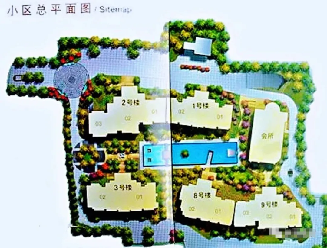 由6幢建筑组成,包括了2幢高层和3幢多层,外加1个会所设施,成两排布局,中间为小区绿化,建有一长方型水景池。