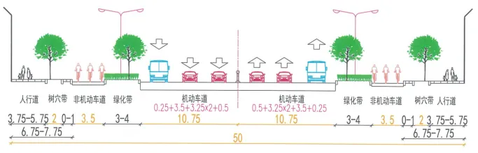 标准横断面:中间21.5米机动车道,两侧各3至4米绿化带,3.5米非机动车道,6.75至7.75米人行道(含2米树穴带)。