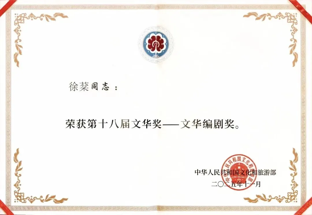 荣获第十四届中国艺术节“文华奖·编剧奖”