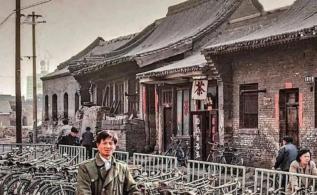 图中这面灰砖墙的门脸叫茶馆,黑色木牌上一个“茶”字,门口栅栏后面拴了好几辆永久牌,屋檐掉着小兽,里头一壶老砖茶一把竹椅,坐下就是半天工夫,现在喝咖啡讲拿铁,那时候端盏盖碗就能聊出门当户对。