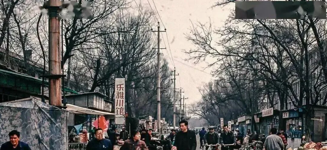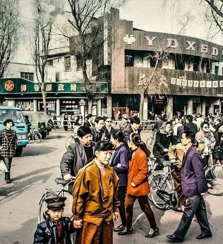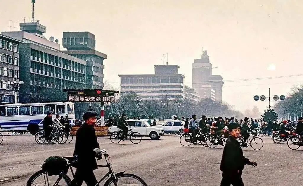 图里这一汪人流就是上下班高峰,黑呢子大衣挤着军绿棉袄,自行车跟白色小面一起过线,红绿灯不着急,大家眼神一对就懂,以前靠默契,现在靠导航,这劲儿不一样了。