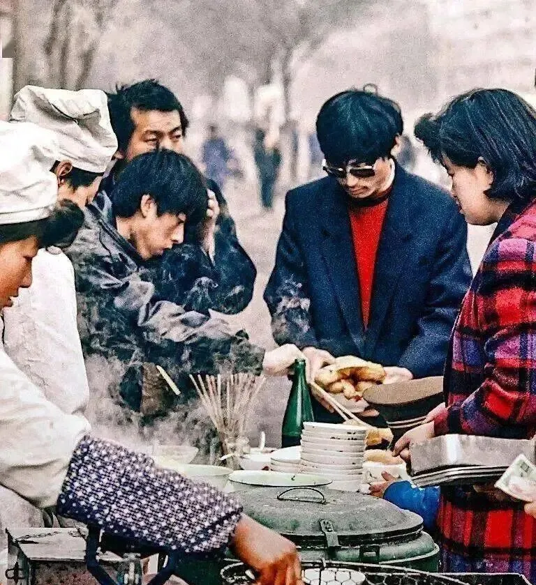 这口冒气的铝锅就是主角,旁边一排搪瓷碗蹭得锃亮,客人把票一递,掌勺的顺手就下丸子,夹油条那位戴着墨镜,像个电影里的角儿,碗到手先哈两口再喝,嘴边全是汤雾。