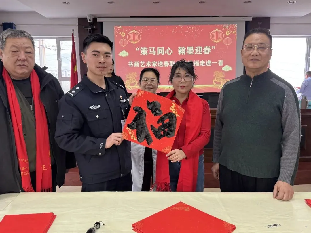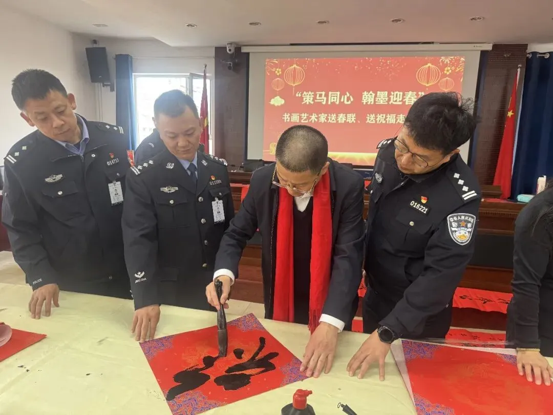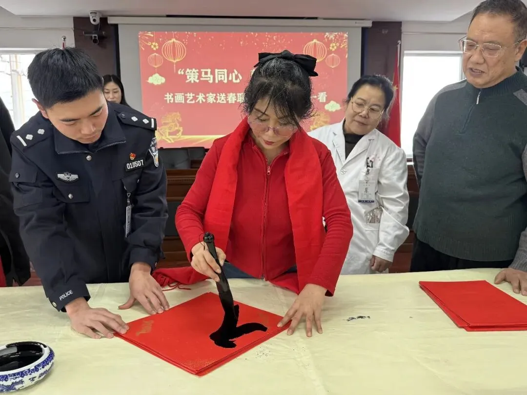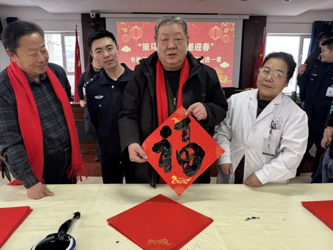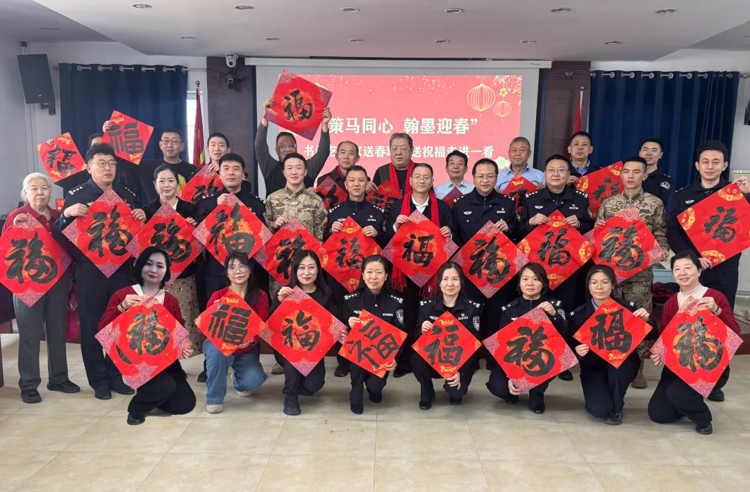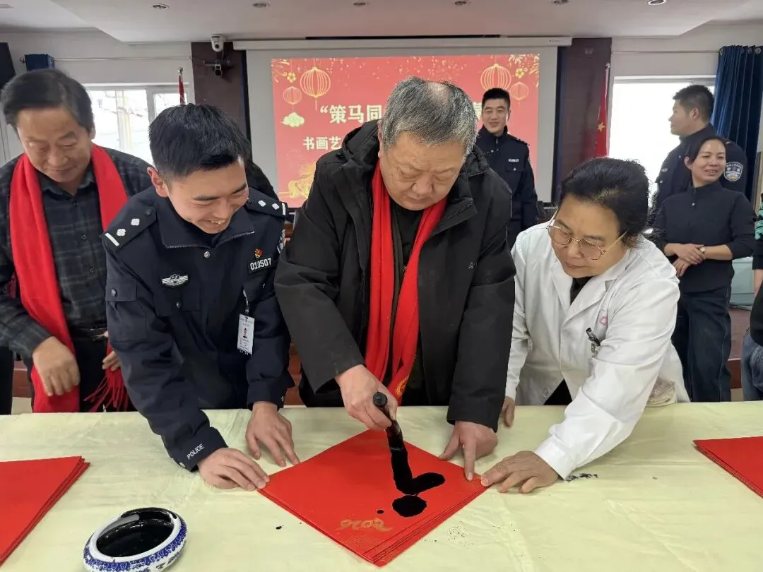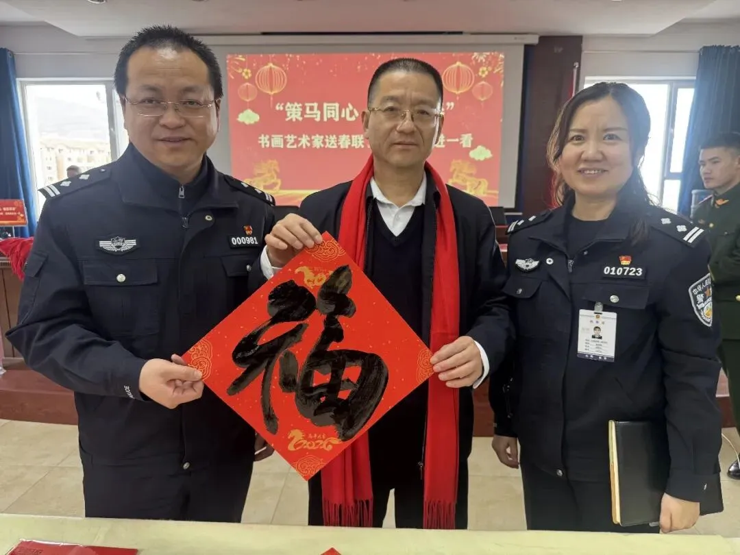 岁序更替,春潮渐涌,在马年新春佳节来临之际,为深入弘扬中华优秀传统文化,传递社会各界对公安队伍的关怀与敬意,活动由山西省政协委员、山西省协会书画专业委员会主席张文生及书画院艺术家高俊、张瑞红、安益成、董福来、师小明、任跃宏、薛通川、李维亮、曹文娟、任倩倩、张如玉、王贵梅等书画艺术家满怀热忱走进警营,以笔墨为媒、以春联为礼,为长期坚守在平安建设一线的民辅警送上浓浓的新春祝福与文化滋养,让墨香浸润警营,让温情凝聚警心。一群心怀公益的书画艺术家走进太原市一看守所,开展“策马同心、翰墨迎春”送春联送祝福活动,以笔墨为媒,将新春的美好期许与人文关怀送到监管民警手中,让特殊场所里也洋溢着浓浓的年味与暖意。