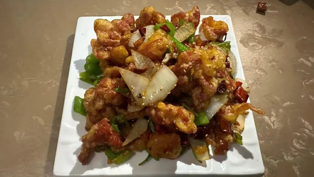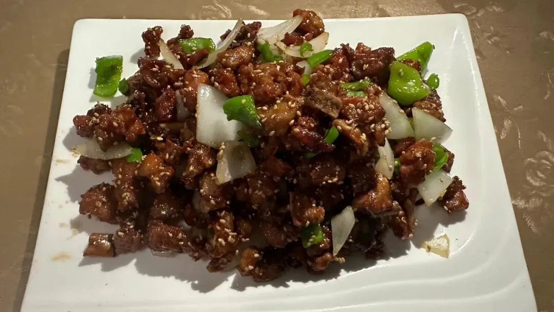 另一道明星菜是“蒙阴小爪鸡”。这道菜几乎成了这家店的代名词,甜咸微辣的口感很特别。鸡块先炸后炒,裹着薄薄的糖衣,配上青椒、洋葱和芝麻,香气四溢。