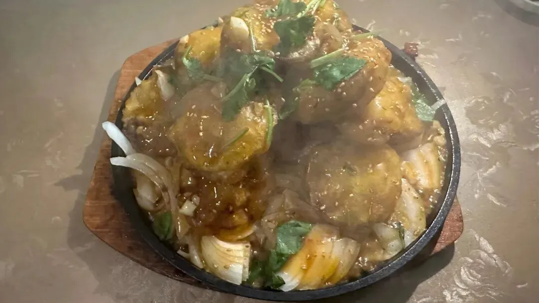 铁板茄盒刚上桌时滋滋作响,外酥里嫩,里面夹着实在的肉馅。不过要趁热吃,凉了之后确实味道会差一点。