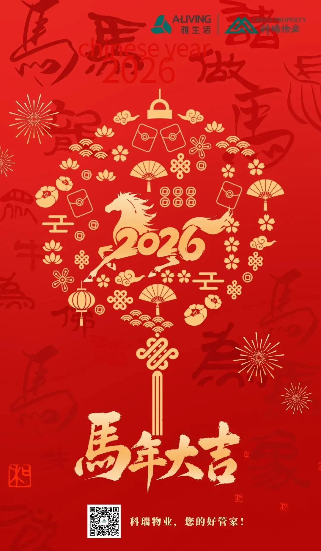 金马踏春,福满家园。值此2026年新春佳节,科瑞物业太原分公司全体员工,向广大业主及家人致以诚挚祝福!愿您在新的一年:龙马精神,马到成功!感恩相伴,不负所托,新岁我们将继续坚守岗位,以贴心服务守护家园安暖。祝您阖家幸福,万事顺遂,新春大吉!
