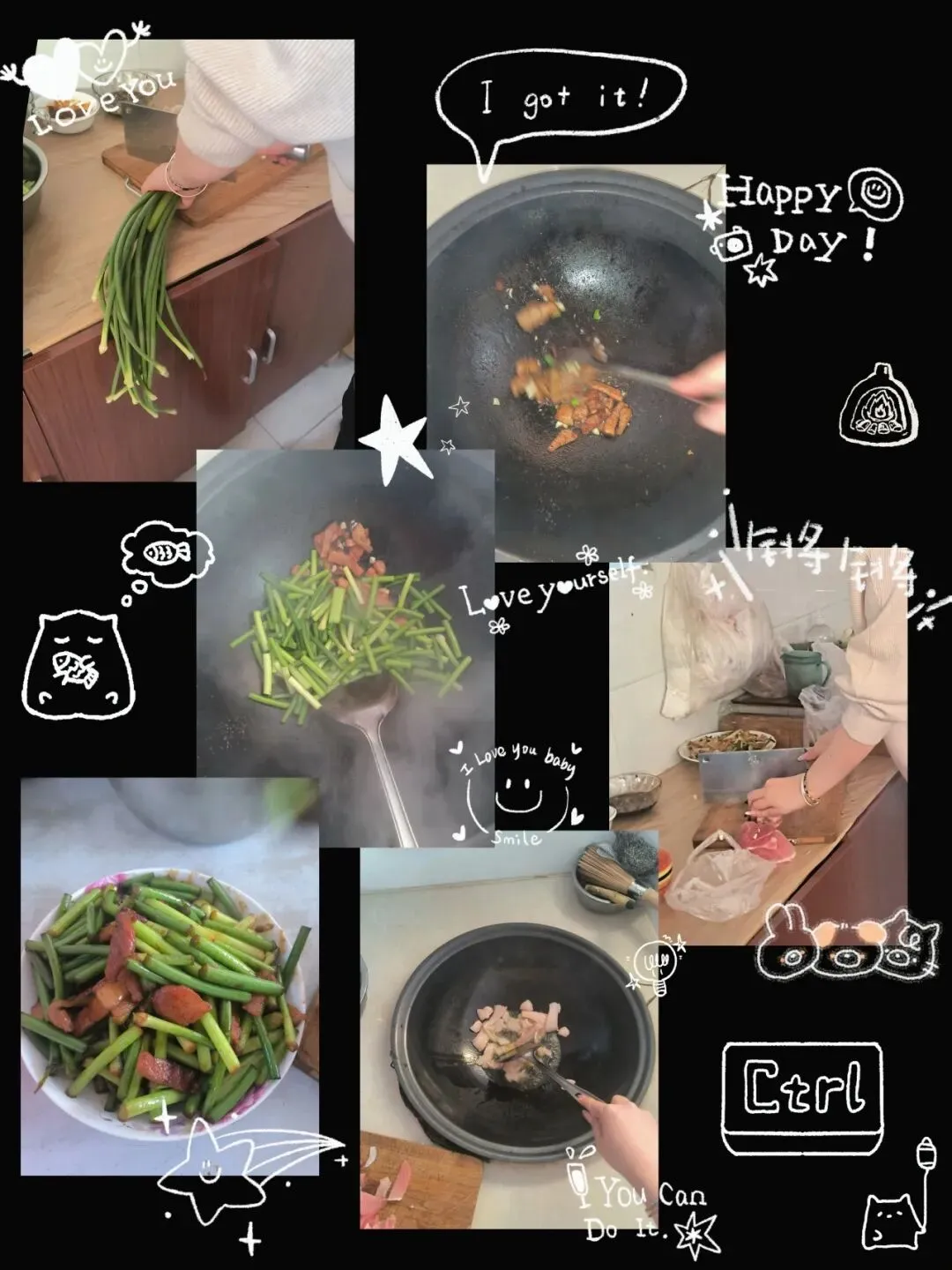 鲜嫩脆爽的蒜苔带着独有的清鲜辛香,红绿相间鲜亮讨喜,寓意新的一年生机盎然、岁岁常青;肥瘦相宜的肉片煸炒得焦香入味,油润不腻,象征日子红火富足、有滋有味。