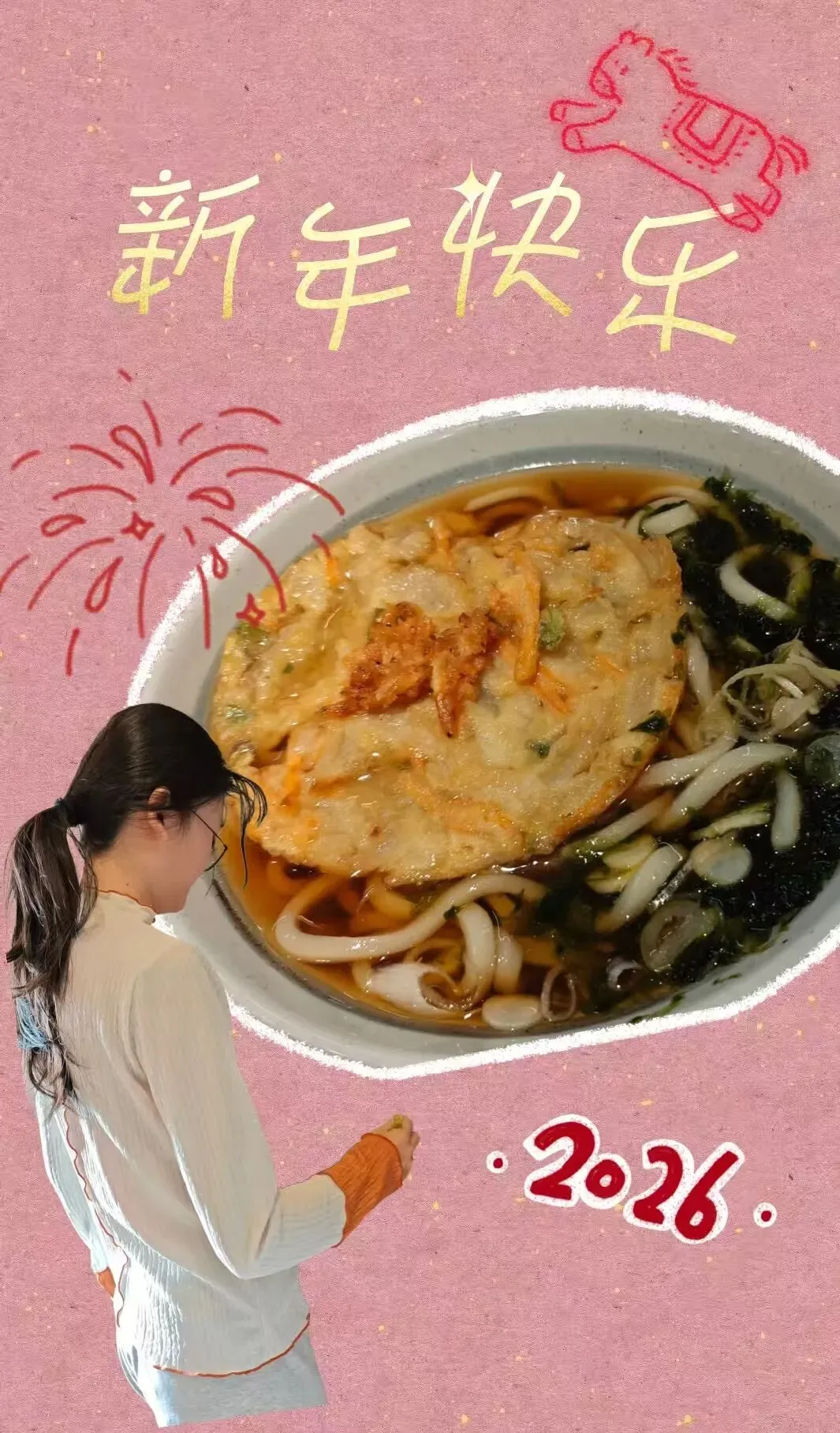 今年的年夜饭,特意添了这碗热腾腾的乌冬面。煮好面后,放一片煎鸡蛋,撒上海藻葱花。除夕吃一碗长面,祈愿家人平安长寿;咬一口煎蛋,盼着来年日子金灿灿。烟火氤氲中,这碗平凡的面,盛满了团圆的暖意,也藏着对新岁最朴实的期许。