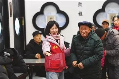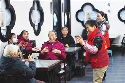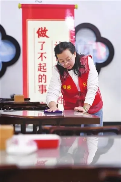 54岁的王雪琴带领老人们做餐前操,她与丈夫在这里做志愿者已有半年时间。45岁的王晓颖负责餐后的保洁工作,她做志愿者时间已超过一年。