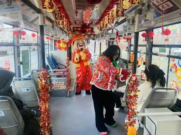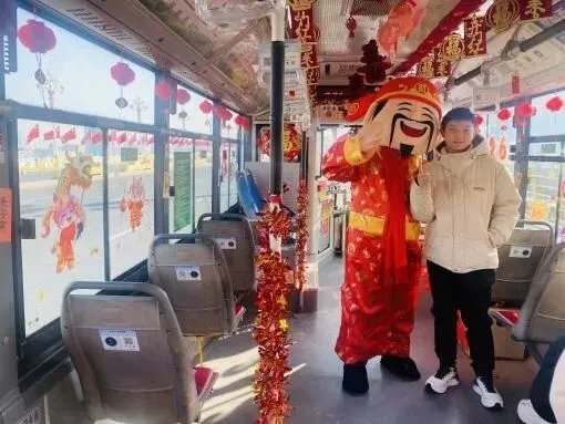 上午9时,一辆装扮一新的27路“清风线路”公交车缓缓驶出长风商务区停车场。车窗上贴着骏马奔腾的窗花,扶手拉环上悬挂着“马到成功”的祝福牌,座椅温暖舒适,整个车厢洋溢着浓浓的年味。当车门打开时,乘客们眼前一亮,身着红袍、手持金元宝的“财神爷”正笑盈盈地站在车厢内迎接大家。“您好,过年好!送您一个我们公交定制的钥匙扣,祝您马年大吉!”随着“财神爷”的一声声祝福,车厢里瞬间沸腾起来,孩子们好奇地摸着“财神爷”,年轻乘客纷纷掏出手机合影留念,老人们则笑得合不拢嘴。