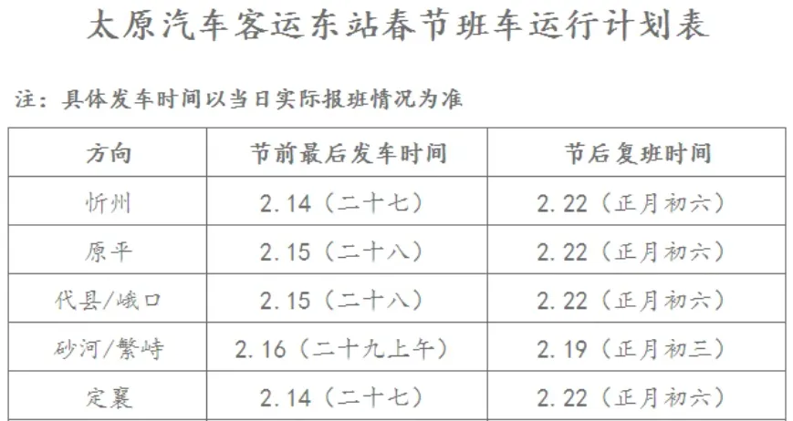 >定襄⇌太原客运班车2026年春节运行计划表公布