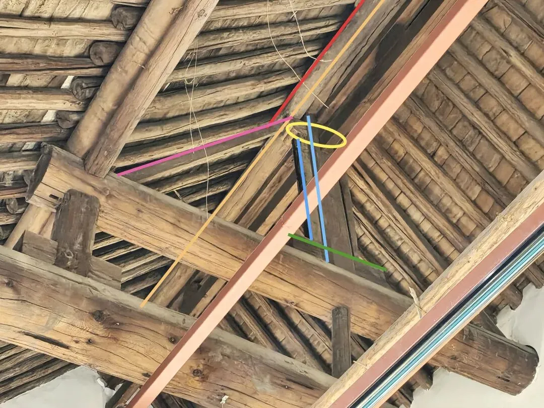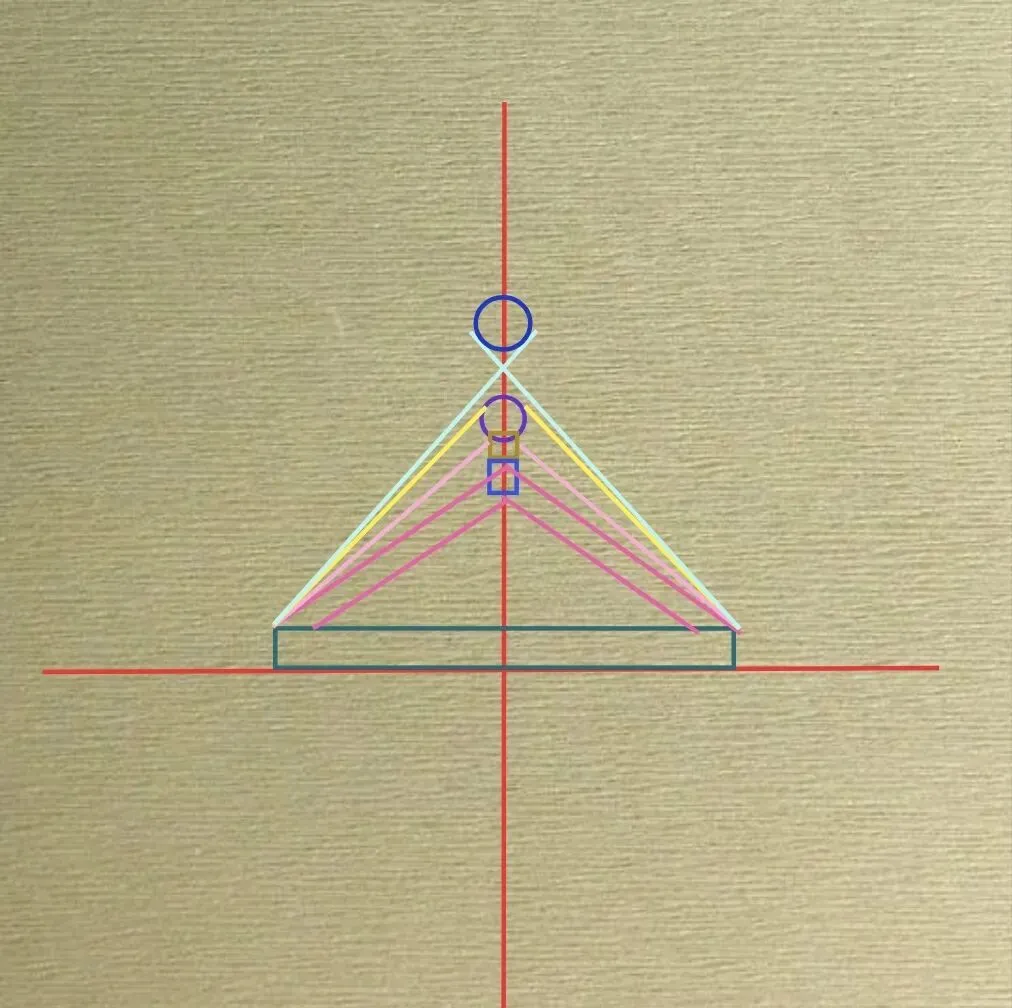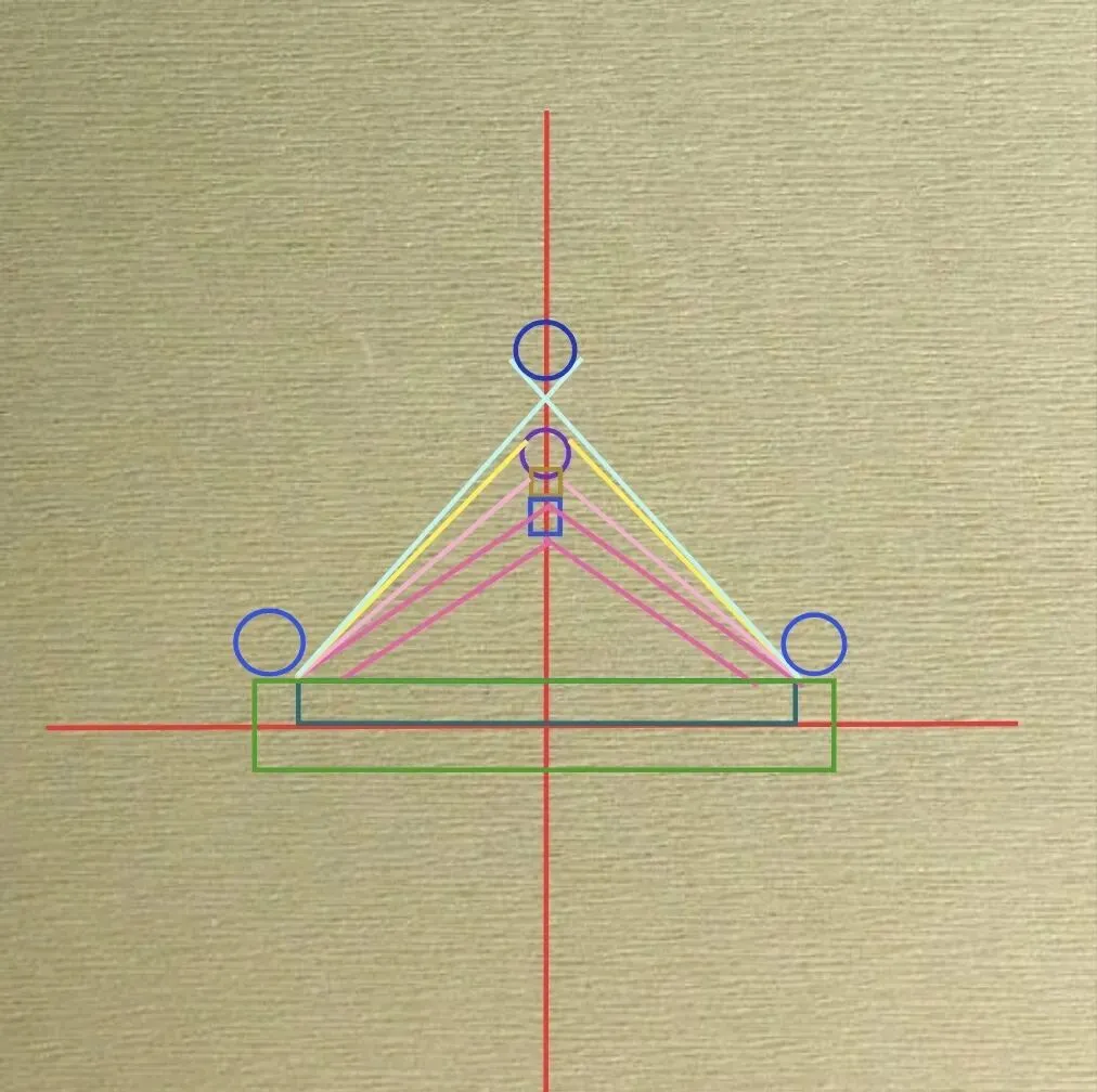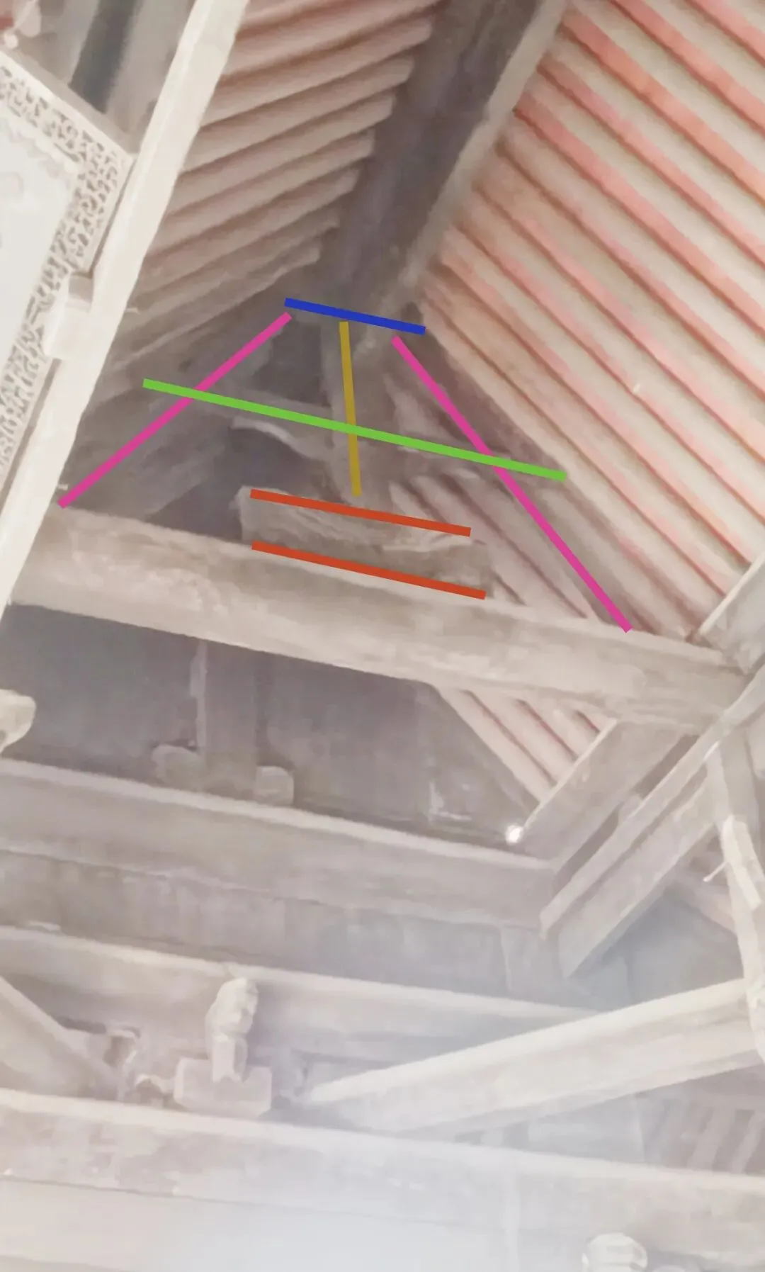 图中下方,紫红色、浅粉色、黄色线代表的叉手位置,不断往上移,代表唐到清整体上的叉手位置变化趋势。其力学作用,不断从承重(分担来自脊槫上方的重力)到稳定蜀柱、脊槫位置转变。