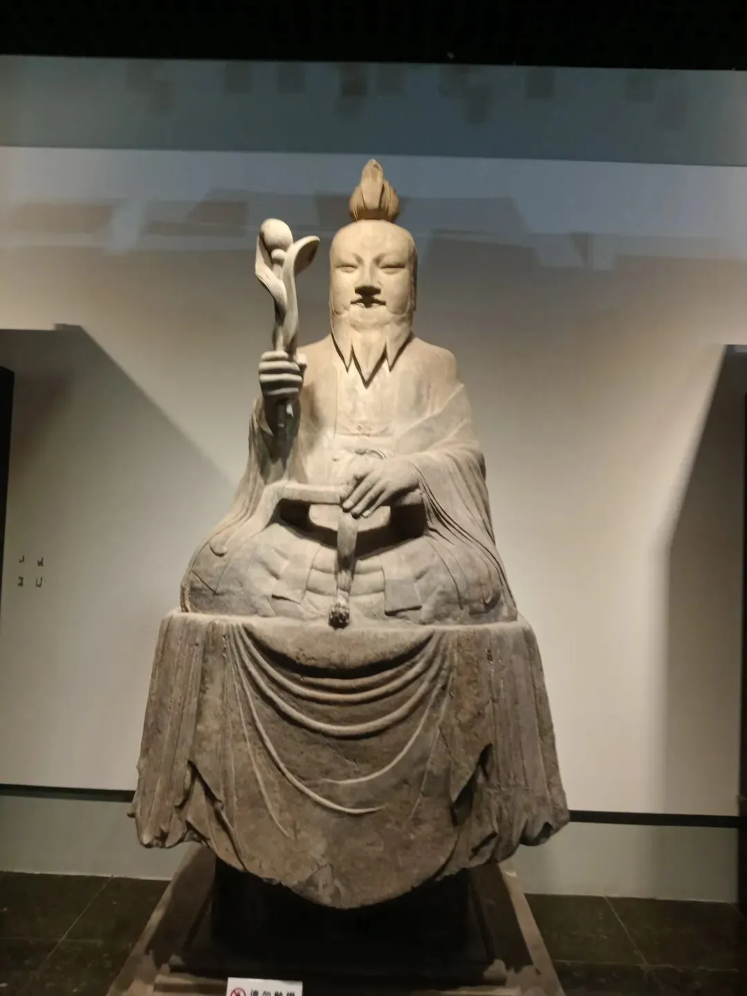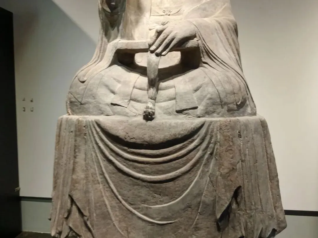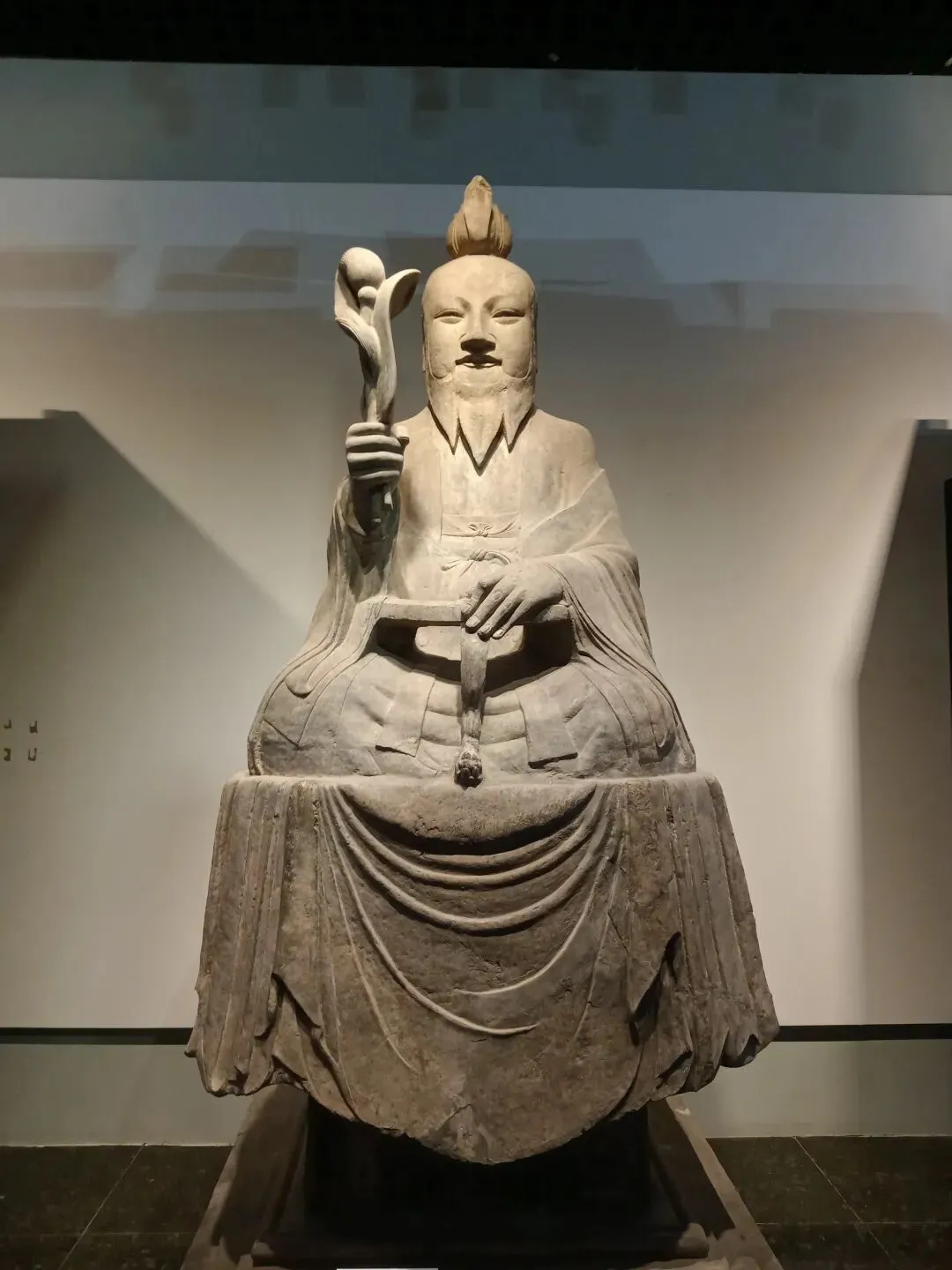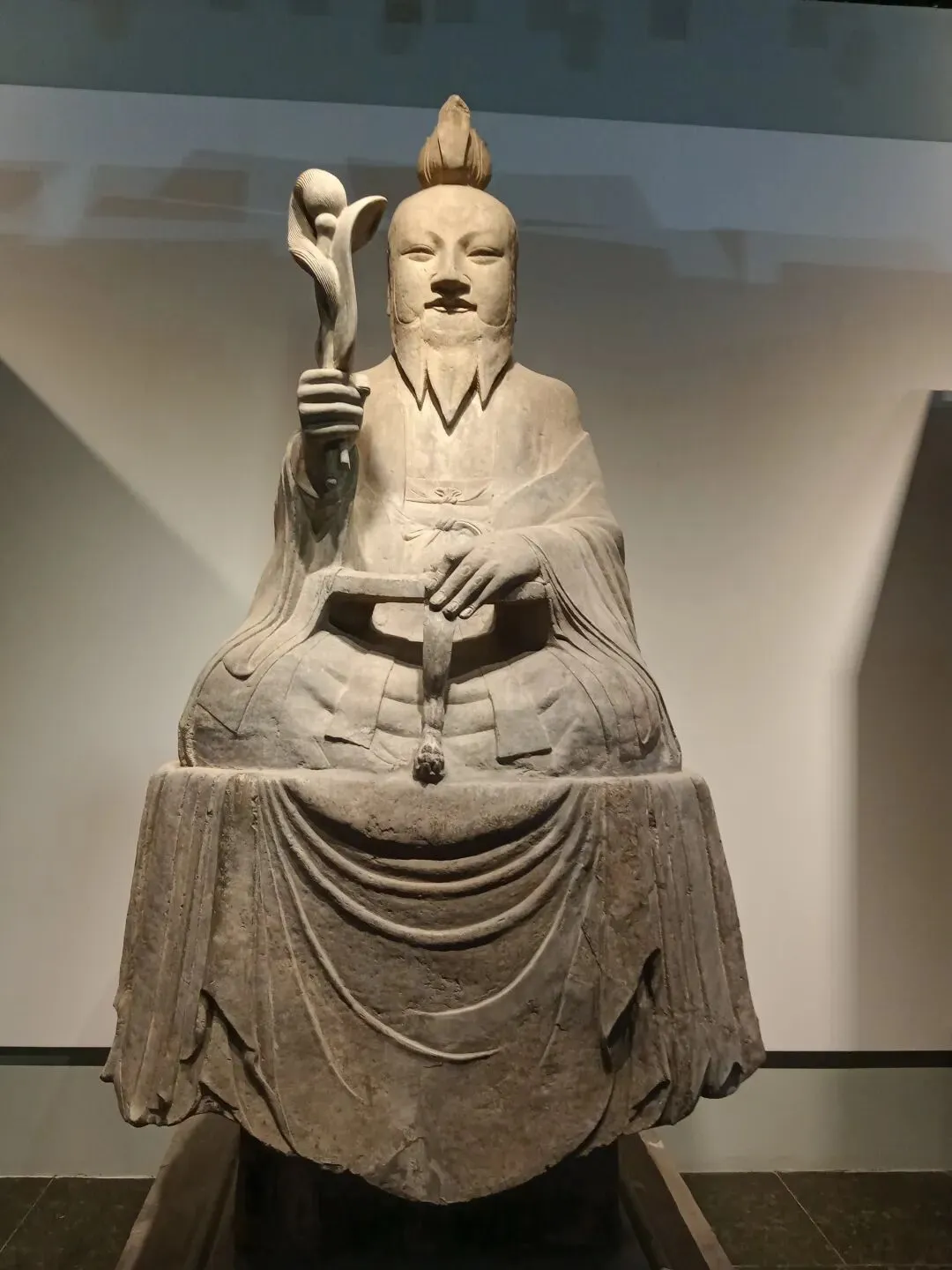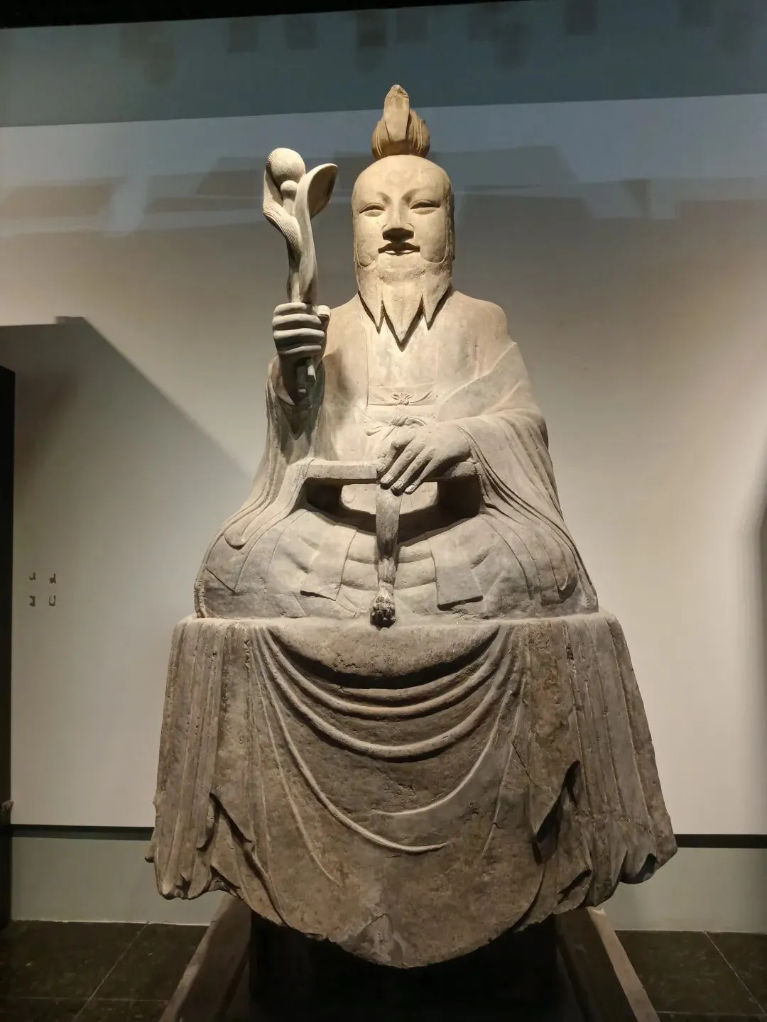 常阳天尊像造型丰颐,线条圆润流畅,具有典型的唐代造像风格。天尊头戴莲花形冠,面相丰颐,细目微眯,长髯垂胸,神态安详慈和。天尊身着宽大道袍,盘坐于长方形石座之上。右手执芭蕉扇和拂尘,左手凭几而放,颇具仙风道骨之韵。石像面容饱满,衣纹清晰流畅,气度不凡。基座四周线刻着莲花、忍冬、仙鹤等祥瑞纹样,底座正面刻天尊像铭并序,两侧及背面线刻弟子道士像和供养人姓氏。2002年国家文物局发布的《首批禁止出国(境)展览文物目录》中,常阳天尊像以其独特的历史和艺术价值成为首批禁止出国(境)展览文物之一。