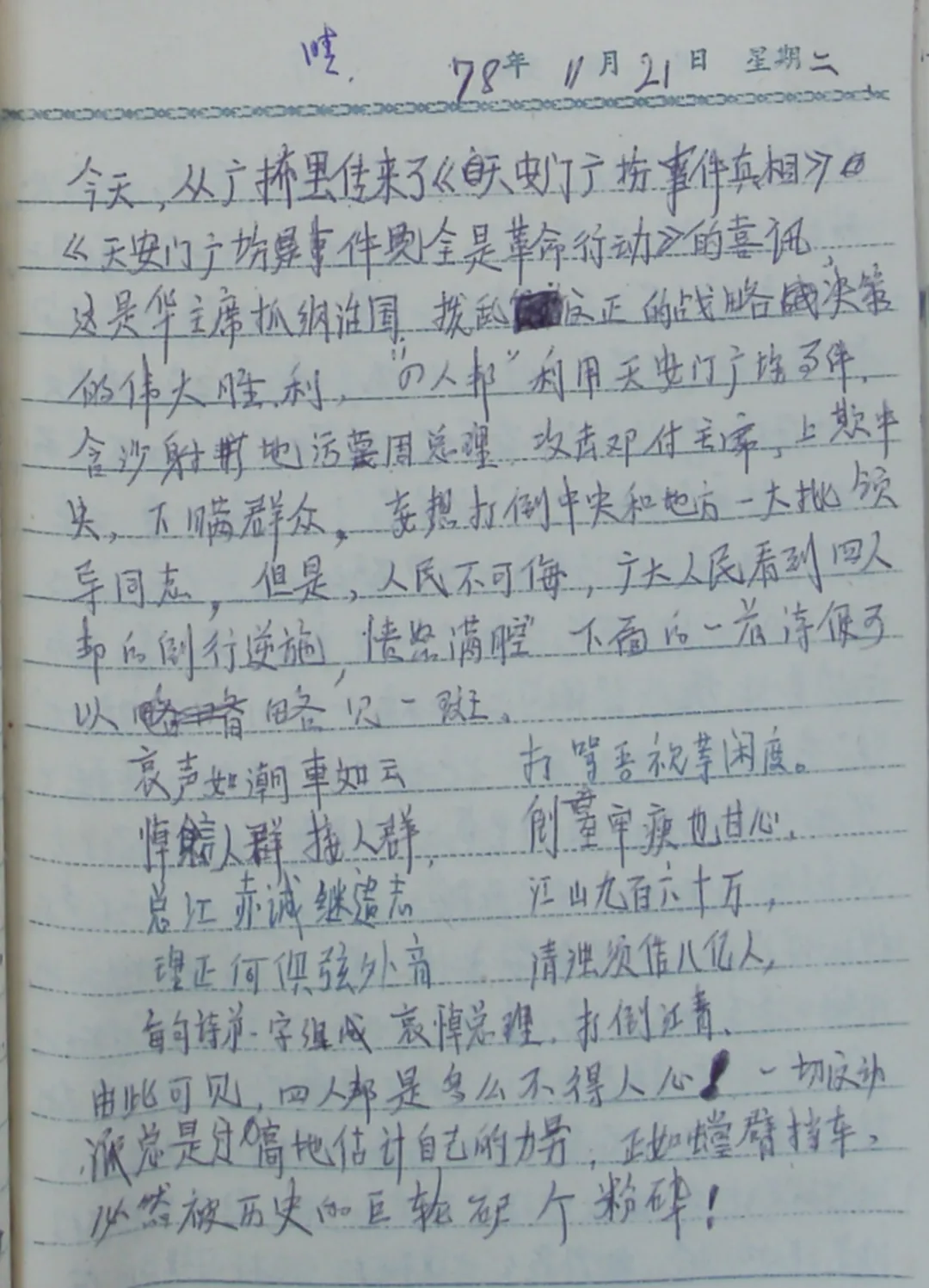这一年,中央为“天安门事件”平反。对于学生来说,从“留小平头的暴徒”到“完全是革命行动”的转变,还是有些震惊。好在我们跟上形势也快,当时的日记这样记载: