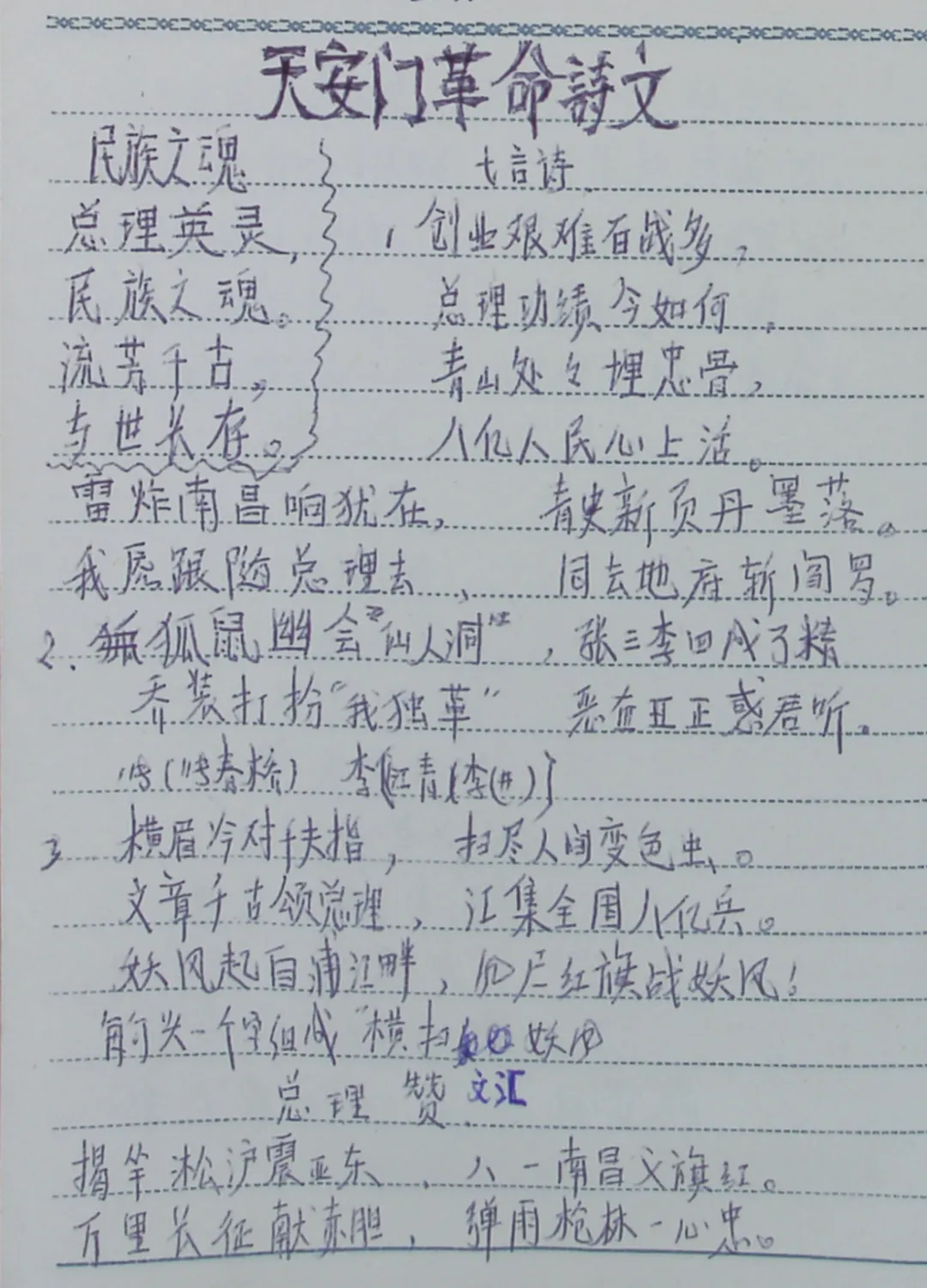 此后不久,《天安门诗抄》出版,一时洛阳纸贵,一书难求。我们只好也以“诗抄”的形式记录。