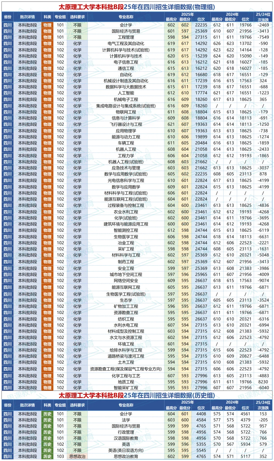 太原理工大学在四川省招生分为多个专业组。以下是25年各专业招录分数,家长注意点赞收藏!