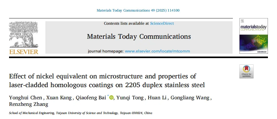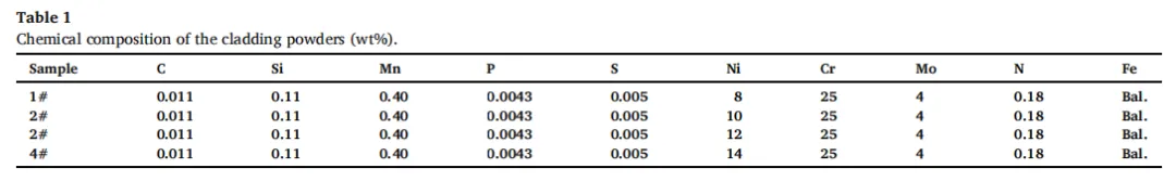 本研究采用激光熔覆技术在2205双相不锈钢表面制备了同系粉末涂层,通过评估镍当量对涂层耐磨性、耐腐蚀性及微观组织的影响,确定了最佳熔覆粉末成分。实验结果表明: