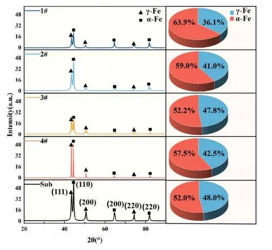 激光熔覆的快速加热与冷却过程导致其处于热力学非平衡状态,使得2205双相不锈钢熔覆层中铁素体与奥氏体相比例难以精确控制,进而影响性能表现。本研究通过固定铬当量并调控镍当量设计合金粉末,并将其应用于2205基体表面进行激光熔覆。通过微观组织分析、显微硬度测试、磨损与电化学腐蚀实验,系统评估了镍当量的影响。结果表明,所有熔覆层的腐蚀电流密度均较基体降低一个数量级,其中#3与#4样品表现出最优的耐腐蚀性能。此外,#1样品的硬度最高、耐磨性最佳。本研究为2205双相不锈钢的激光熔覆修复及粉末成分设计优化提供了理论依据。