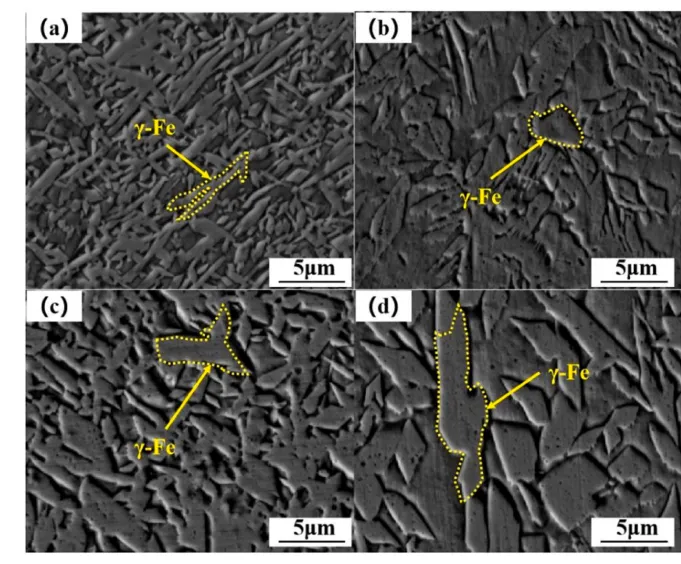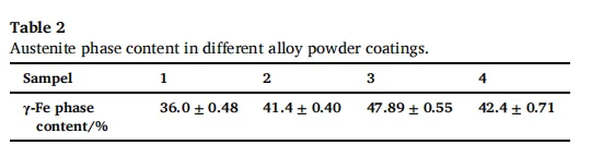 (1)随着镍含量的增加,奥氏体(γ-Fe)相含量呈上升趋势,但镍含量达到14 wt%时反而减少。这可能是由于快速冷却过程中镍元素扩散不充分,导致奥氏体含量降低,进一步证实了镍当量变化对熔覆层相组成调控具有显著影响。
