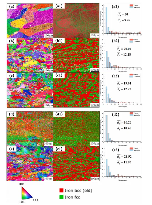 图6.不同试样 EBSD :(a)–(e) IPF ,(a1)–(e1)相分布,(a2)–(e2)晶粒尺寸。