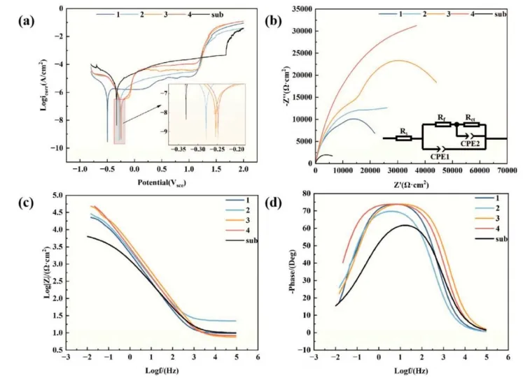 图7. (a) 极化曲线;(b) 纳伊奎斯特图及等效电路;(c) 对数幅频图;(d) 对数相频图。