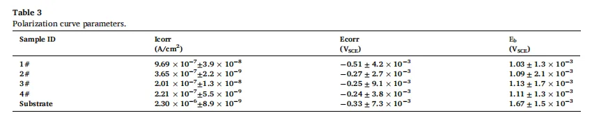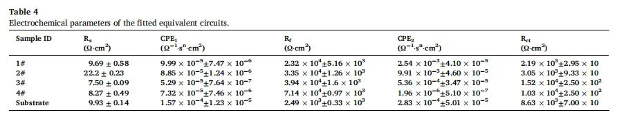 (2)提高镍含量后,微观组织中γ-Fe相含量逐渐增加,比例接近50%。α-Fe相与γ-Fe相的相互作用形成了更致密均匀的钝化膜,降低了腐蚀速率,提升了耐腐蚀性能。具体而言,3#与4#涂层的腐蚀电流密度较基体降低一个数量级,且数值最小且相近,其Rct值相比其他试样高出一个数量级,表明其耐腐蚀性能最优。