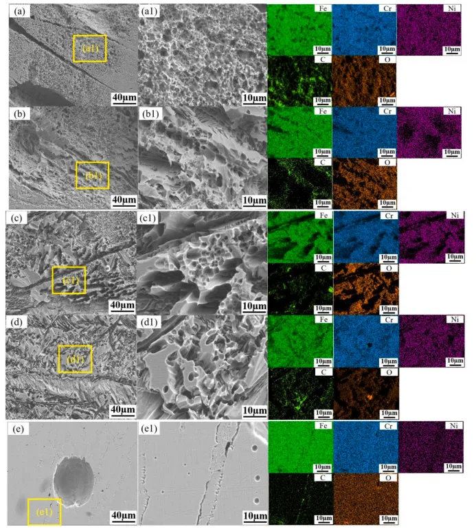 图9. 不同试样的腐蚀形貌与EDS元素分布:(a)–(e)腐蚀形貌;(a1)–(e1)腐蚀表面放大视图及对应EDS结果。