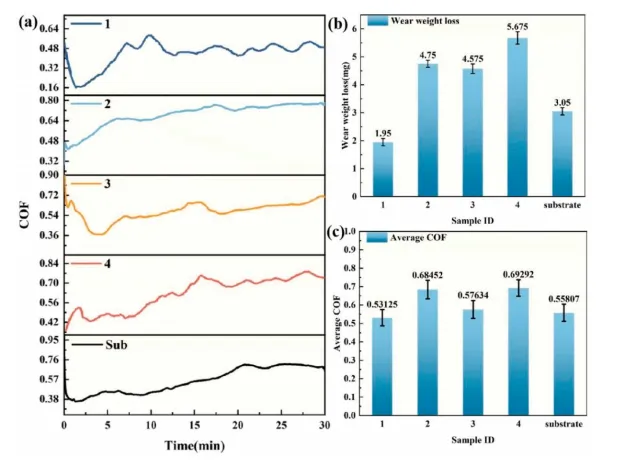 图10. (a) 摩擦系数曲线;(b) 磨损量;(c) 平均摩擦系数。