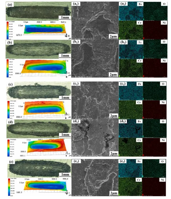 图12. 不同样品的摩擦系数、三维形貌及EDS元素分布:(a)–(e) 摩擦系数与三维形貌;(a1)–(e1)摩擦形貌;(a2)–(e2)EDS元素分布。