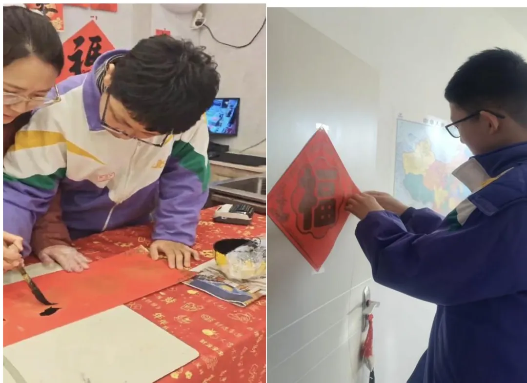 许多同学是第一次拿起毛笔,第一次在红纸上郑重落笔。手抖了,墨洒了,横不平,竖不直——但这些都不重要。重要的是,他们用心写下了对新年的祝福。看着同学们握笔的手,老师们知道,握住的不只是毛笔,更是文化的根。哪怕只是一个略显稚嫩的“福”,也是世界上独一无二的“福”。如果说寻找春联是与传统的对话,那么亲手书写,便是与自己的对话。许多同学是第一次拿起毛笔,第一次在洒金红纸上郑重落笔。手抖了,墨洒了,横不平,竖不直——但这又何妨?重要的是,他们用心写下了对新年的祝福。那份认真,比字迹本身更动人。因为它里面,有你的心意,有你的努力,有你对这个新年的全部期待。