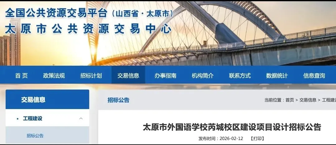 2月12日,全国公共资源交易平台发布《太原市外国语学校芮城校区建设项目设计招标公告》、《太原市外国语学校芮城校区建设项目勘察招标公告》。