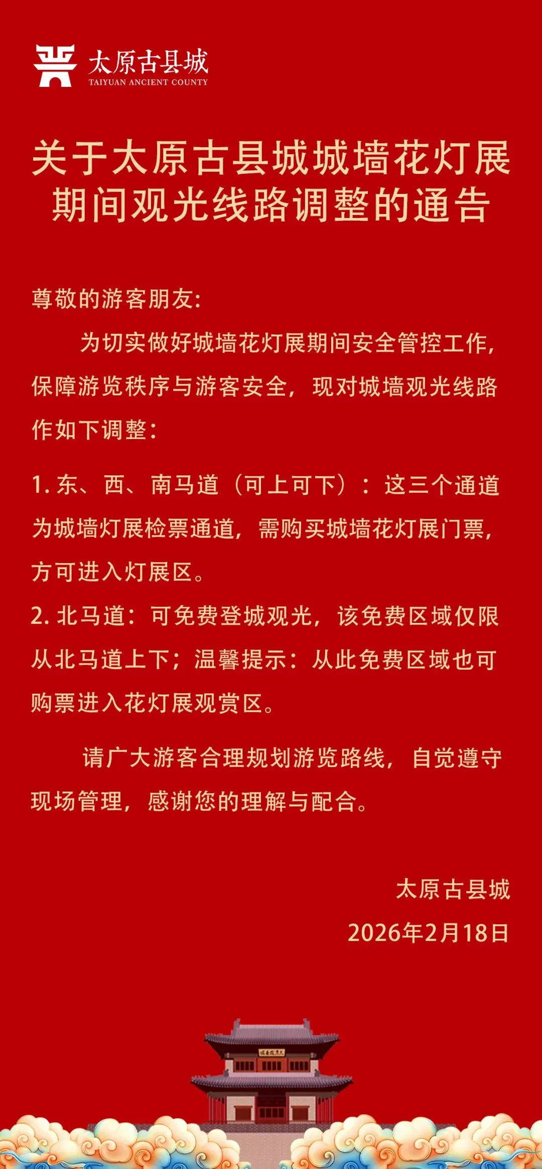 关于太原古县城城墙花灯展期间观光线路调整的通告