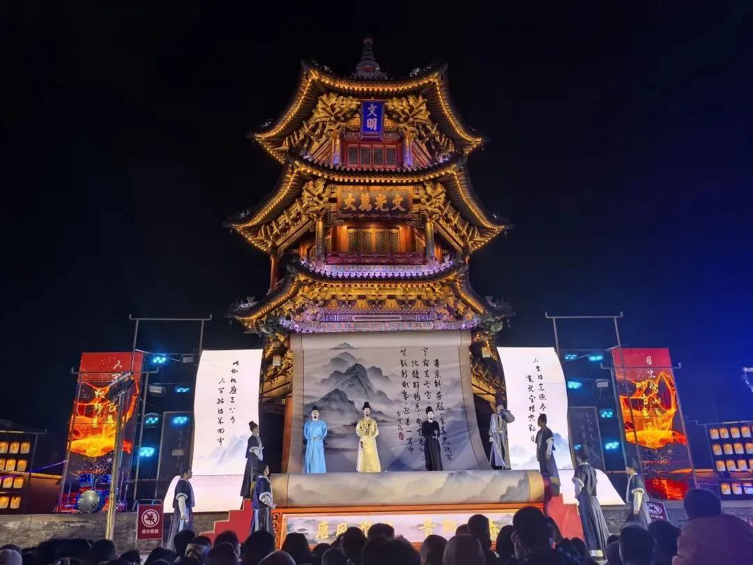 这里有各种民间艺术表演,滑旱船,踩高跷的,唱大戏的。人流中,不时穿插着情境剧表演。