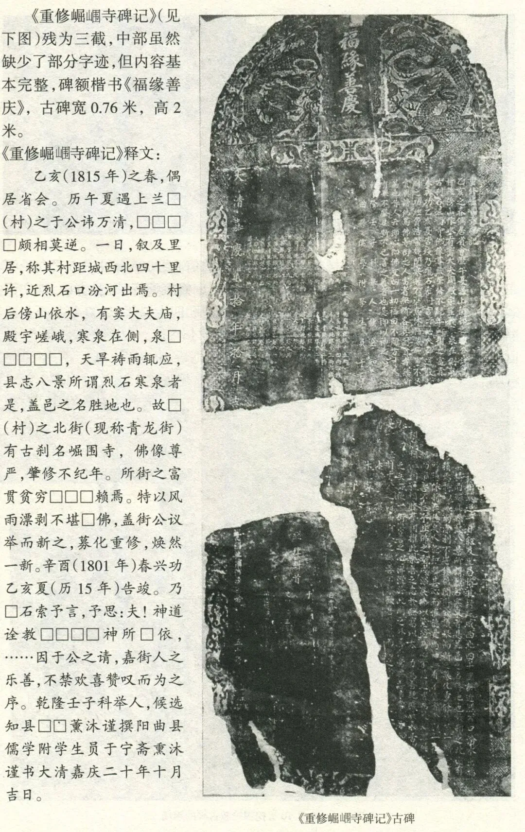 “《重修崛围寺碑记》(见下图)残为三截,中部虽然缺少了部分字迹,但内容基本完整,碑额楷书《福缘善庆》,古碑宽0.76米,高2米。《重修崛围寺碑记》释文:‘乙亥(1815年)之春,偶居省会。历午夏遇上兰口(村)之于公讳万清,口口口口颇相莫逆。一日,叙及里居,称其村距城西北四十里许,近烈石口汾河出焉。村后傍山依水,有窦大夫庙,殿宇嵯峨,寒泉在侧,泉口口口口口,天旱祷雨辄应,县志八景所谓烈石寒泉者是,盖邑之名胜地也。故口(村)之北街(现称青龙街)有古刹名崛围寺,佛像尊严,肇修不纪年。所街之富贵贫穷口口口赖焉。特以风雨漂剥不堪口佛,盖街公议举而新之,募化重修,焕然一新。辛酉(1801年)春兴功,乙亥夏(历15年)告竣。乃口石索予言,予思:夫!神道诠教口口口口神所口依,一因于公之请,嘉街人之乐善,不禁欢喜赞叹而为之序。乾隆壬子科举人,候选知县口口薰沐谨撰,阳曲县儒学附学生员于宁斋熏沐谨书,大清嘉庆二十年十月吉日。’”