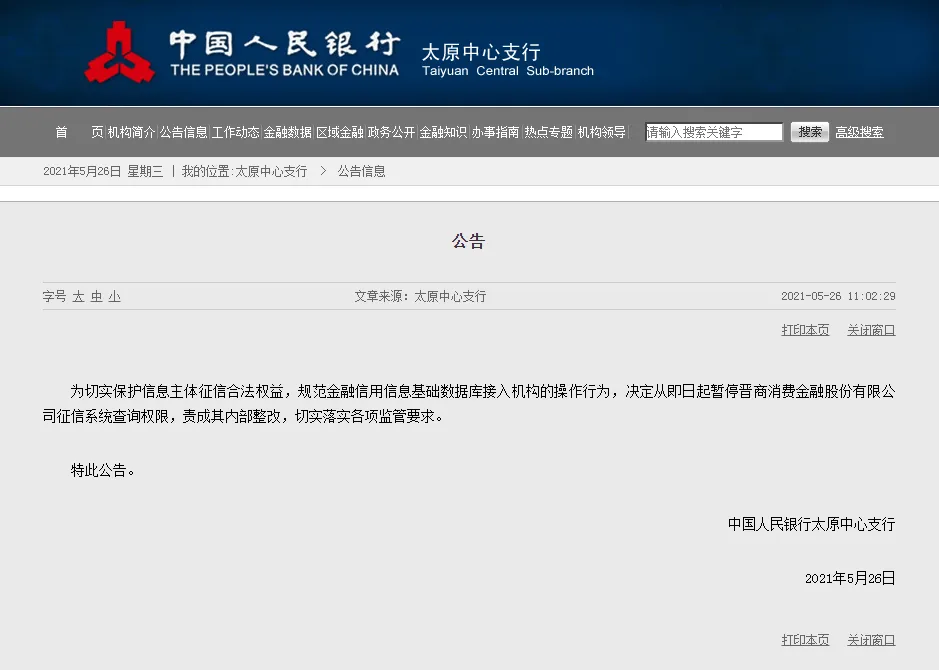 为切实保护信息主体征信合法权益,规范金融信用信息基础数据库接入机构的操作行为,决定从即日起暂停晋商消费金融股份有限公司征信系统查询权限,责成其内部整改,切实落实各项监管要求。